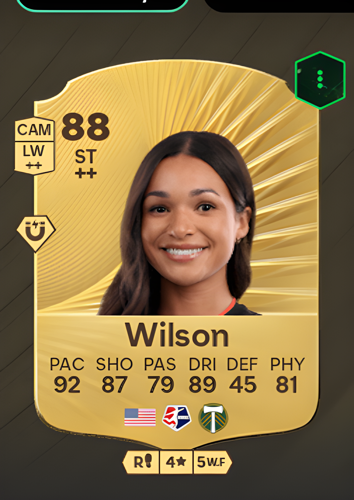Sophia Wilson’s Gold Rare card stands out as a top-tier Striker, boasting an impressive overall rating of 88. With lightning-fast pace rated at 92 and exceptional dribbling at 89, she is a constant threat to any defense. Her shooting rating of 87 ensures clinical finishing, while a solid physicality score of 81 allows her to hold her ground against tough opponents. Although her passing and defense ratings are 79 and 45 respectively, her primary strengths lie in her ability to break through defensive lines and capitalize on scoring opportunities. As a striker, this card is a game-changer, giving you the edge to outpace defenders, create chances, and deliver decisive goals when it matters most.