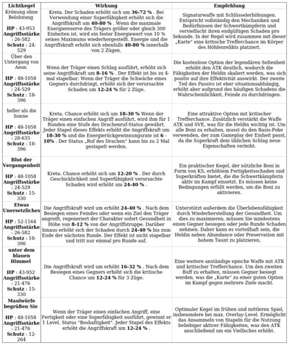 - Kritische Chance: 100 %, wobei während des Kampfes eine Erhöhung um 20 % gegenüber dem Basiswert möglich ist.